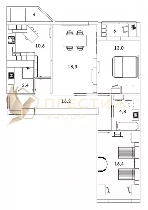 • Гостиная — 18,44 м² (идеальное место для отдыха и семейных встреч)