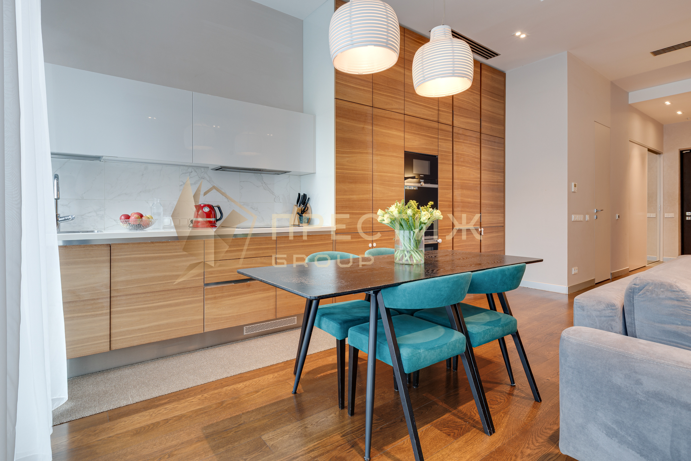 - Большая кухня-гостиная (44 кв.м.), оснащенная премиальной техникой, мебелью от Giulia Novars.