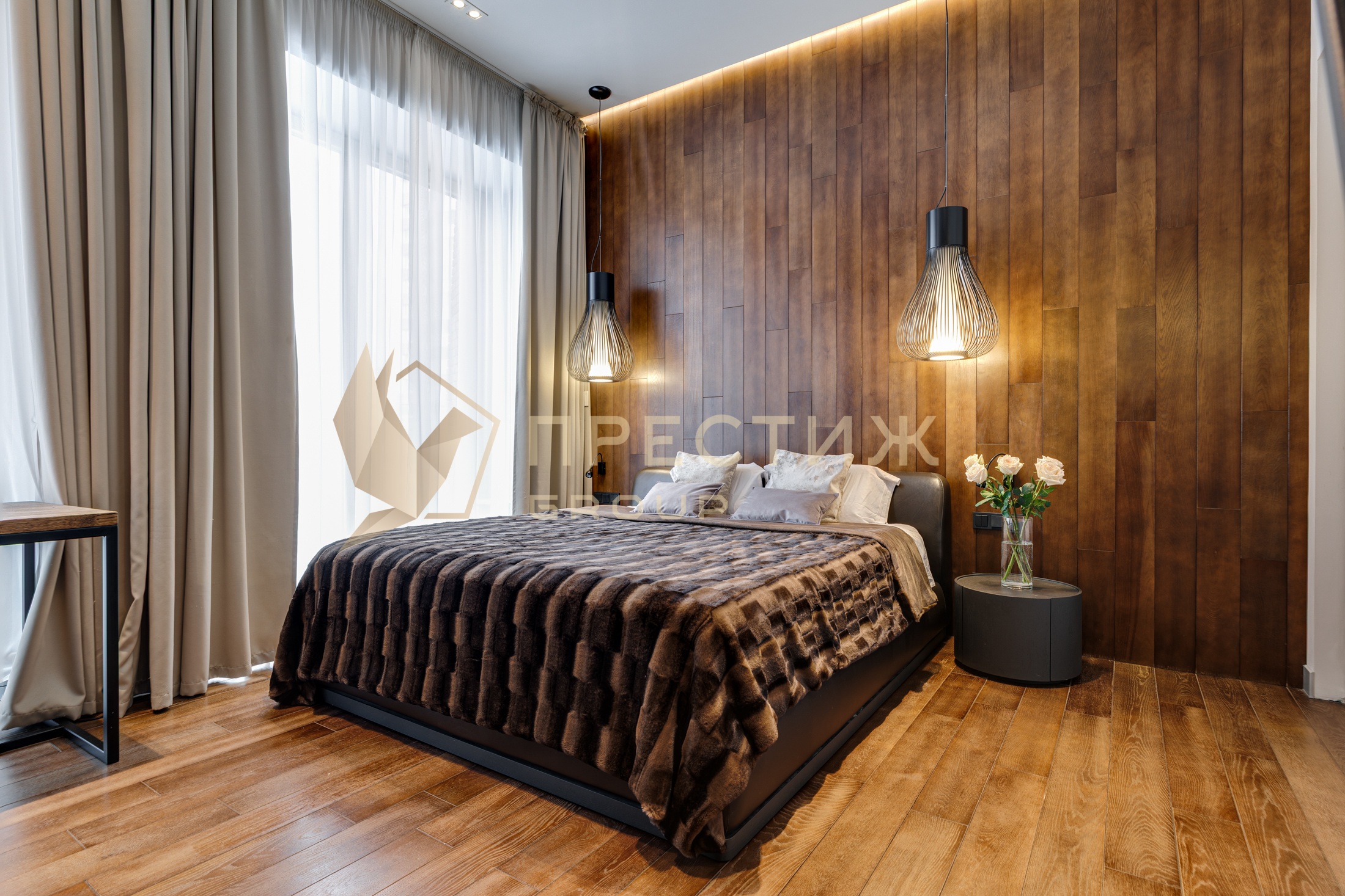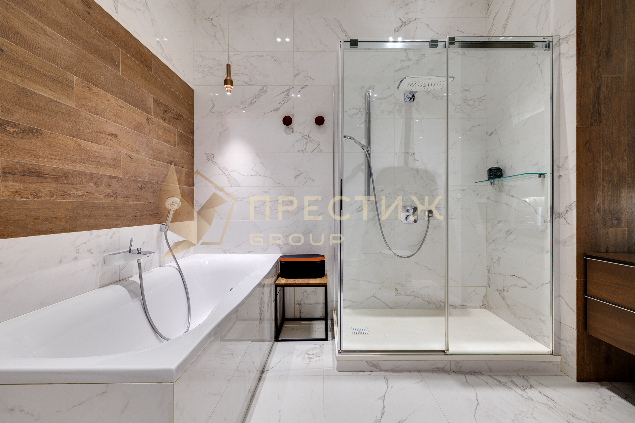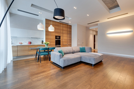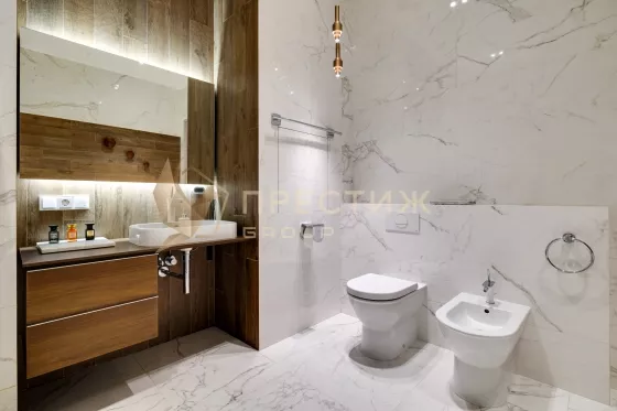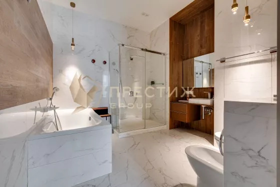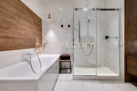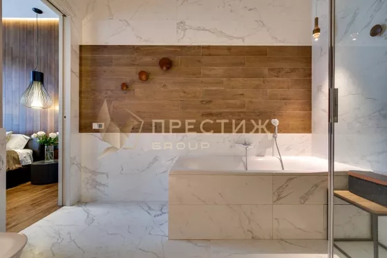 В отделке использованы только натуральные, премиальные материалы - на полу инженерная доска из американского ореха, в ванной комнате керамогранит,